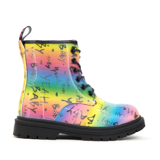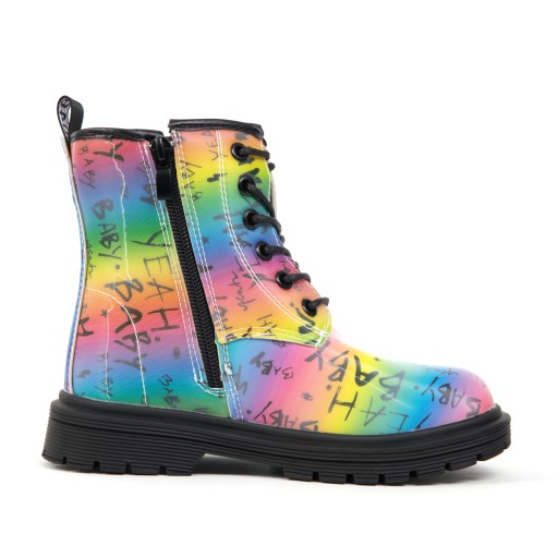 Tęczowa w cholewka z czarnym nadrukiem idealnie wpisuje się w styl oldschoolowych martensów.
