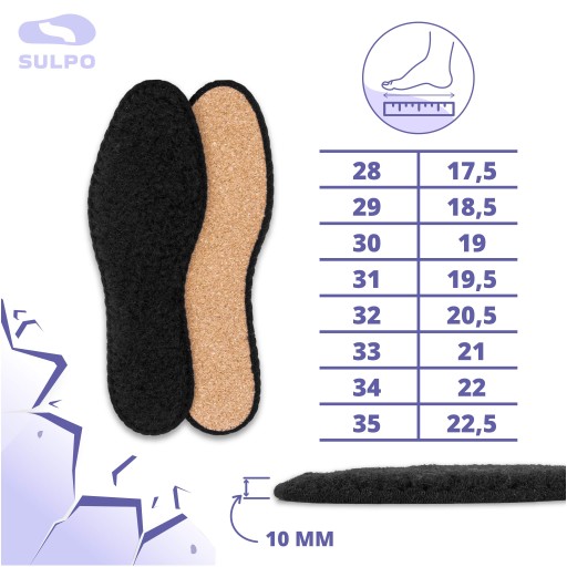 Całkowita grubość wkładki to 10 mm, ale miękki puszek wełniany pod wpływem ciężaru ciała dopasowuje się do stopy. Wkładka robi się cieńsza i dopasowana do kształtu stopy, co podnosi komfort użytkowania tych wkładek.