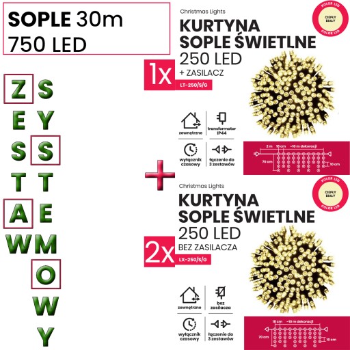 - Zasilacz z timerem + 2m przewodu + 10m sople LED + gniazdo