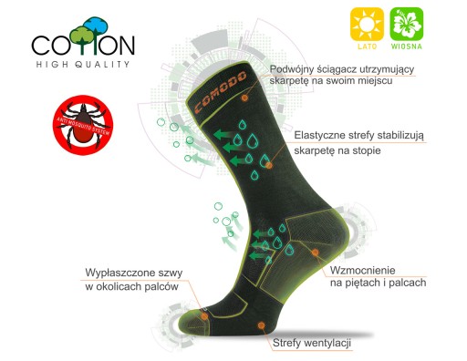 Dzięki zastosowaniu tych technologii skarpety świetnie sprawdzą się w ciepłe letnie dni podczas polowania lub wycieczek po lesie.