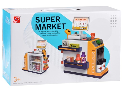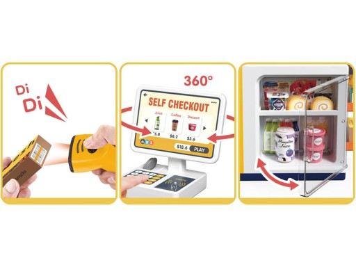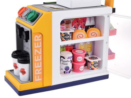 Samoobsługowy sklep spożywczy z ekspresem do kawy, lodówką na napoje to taka szybka "ŻABKA". Szybki punkt obsługi to propozycja dla wszystkich małych przedsiębiorców, którzy nadążają za nowościami w obsłudze klientów. Cały sklep to ekspres do kawy, lodówka na napoje, desery i kasa fiskalna z czytnikiem. Świetny pomysł na zabawę w sprzedawcę, punkt obsługi z napojami, przekąskami.