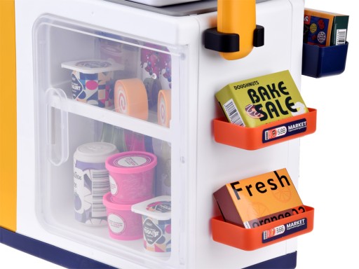 Cały zestaw wykonany z mocnego plastiku, w atrakcyjnych kolorach, posiada półeczki, zamykaną lodówkę na napoje wszystko co jest niezbędne w takim punkcie szybkiej obsługi. Dzieci lubią bawić się w sprzedawców, klientów, a taka zabawka zawsze nauczy czegoś nowego.