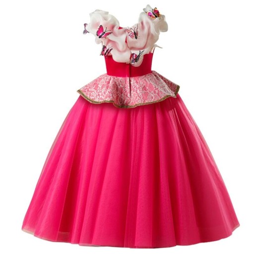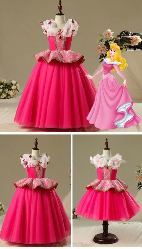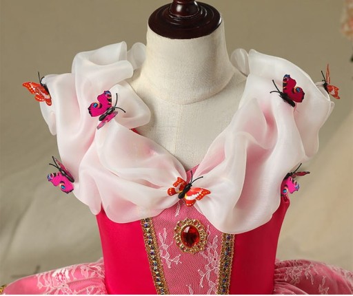 Suknia, która stanowi podstawę tego stroju, została zaprojektowana z dbałością o detale, aby oddać charakter Księżniczki Aurory. Wykonana z miękkich materiałów w kolorach ciemnego różu i bieli, zapewnia wygodę noszenia i swobodę ruchów podczas zabaw i przyjęć. Elegancki krój, delikatne zdobienia i subtelne akcenty podkreślają piękno i wyjątkowość sukni.