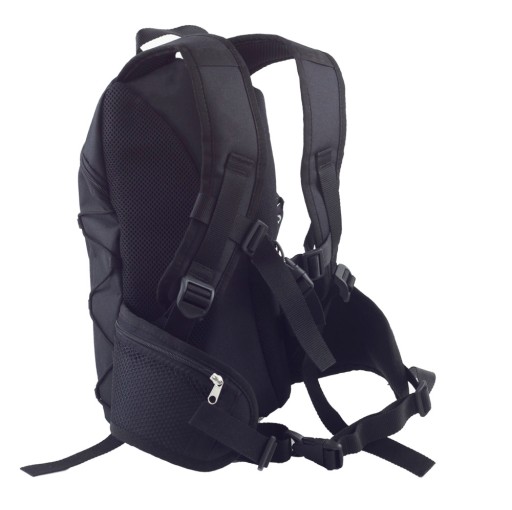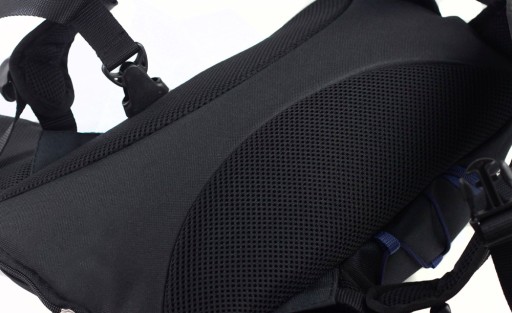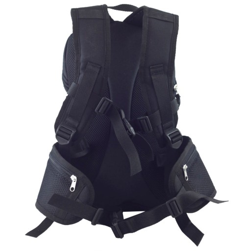 Plecak został wyposażony w regulowany pas piersiowy oraz biodrowy spinane na zatrzaski, profilowane szelki oraz delikatnie usztywnione plecy.