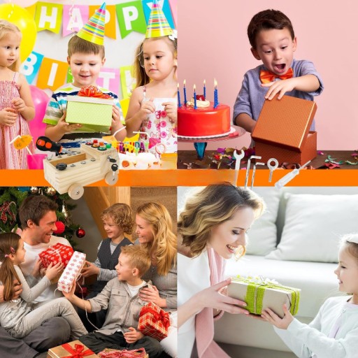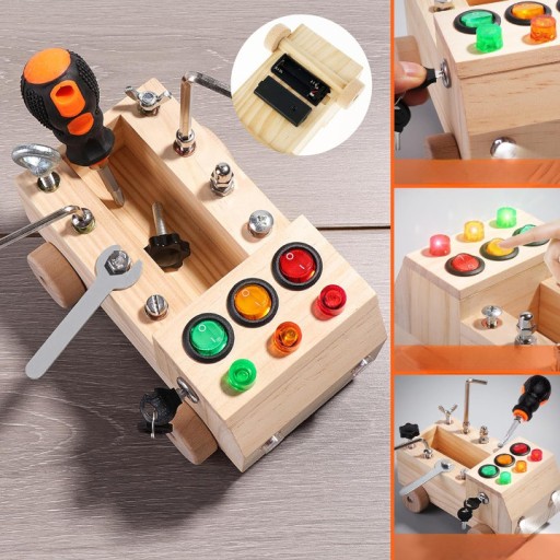 Zabawka jest wyposażona w 8 otworów na przyczepie oraz w różne śruby, nakrętki, wkrętaki i klucze, które pozwalają dzieciom ćwiczyć umiejętności manualne.
