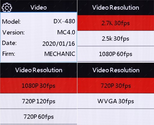 - rozdzielczość video (MP4): 2.7K (2560x1440 30FPS), 2.5K (2304x1296 30FPS), 1080P (1920x1080 60FPS), 1080P (1920x1080 30FPS), 720P (1280×720 120FPS), 720P (1280×720 60FPS), 720P (1280×720 30FPS), WVGA (800×480 30FPS)