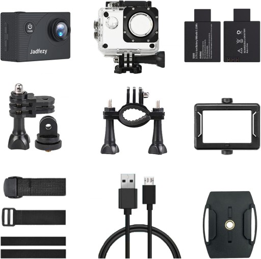 Jadfezy Kamera sportowa 1080P wodoodporna kamera podwodna 40 m z EIS dwie baterie 900 mAh do wielokrotnego ładowania 140 stopni szeroki kąt i zestaw akcesoriów