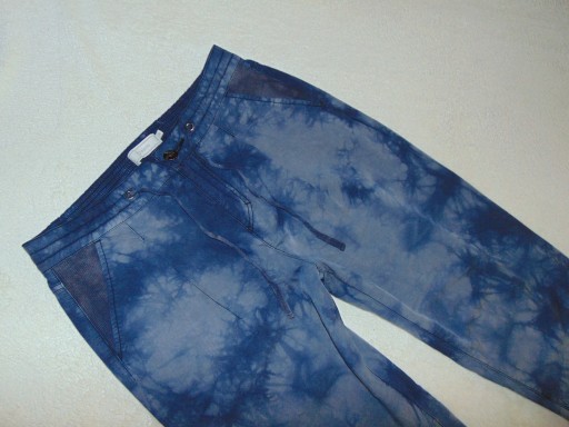 Spodnie damskie w bardzo dobrym stanie, rozmiar z metki 38, zapinane na suwak i guzik, kolor niebieski cieniowane.