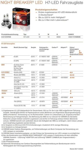 NIGHT BREAKER H7 LED jest pierwszym zamiennikiem LED dla świateł mijania, który został dopuszczony w Niemczech. Rozwiązanie typu plug-and-play oferuje sterownikom znaczące zalety: bardzo wysoką temperaturę barwową zimnej bieli wynoszącą 6000 kelwinów i do 220 procent większą jasność w porównaniu z minimalnymi wymaganiami normy ECE R112, do 5 razy dłuższą żywotność w porównaniu z lampami halogenowymi oraz do 50 procent mniej razi innych kierowców. Używać można tylko w ruchu prawostronnym. Jazda w ruchu lewostronnym (np. W Anglii) wymaga wymiany na lampy halogenowe. Firma OSRAM oferuje akcesoria umożliwiające instalację produktu.