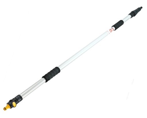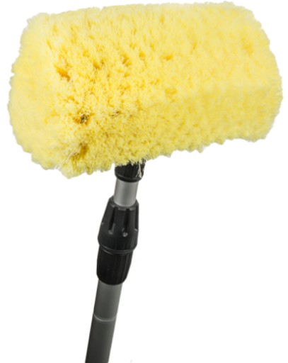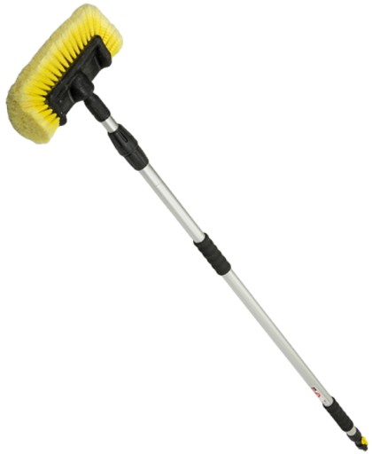 W dolnej części szczotki znajduje się zawór do PODŁĄCZENIA DO WODY, która przepływając przez teleskopową konstrukcję wypływa bezpośrednio przez włosie szczotki na panele