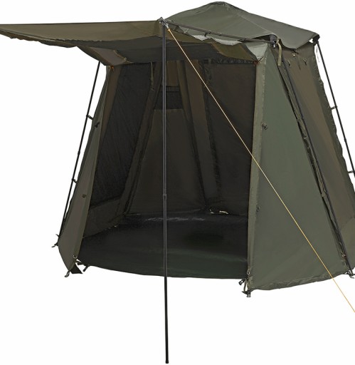 Może być to również doskonała „kwatera główna”, jeśli na zasiadce jest sporo osób i potrzebujecie miejsca, w którym będziecie ustalać taktykę. Lekka aluminiowa rama ma po dwie uchylne nogi i drzwi na dwóch przeciwstawnych ścianach, które można unieść i podeprzeć. Tworzą one dwa duże daszki, które chronią przed słońcem i stanowią idealne miejsce do grillowania lub do odpoczynku i obserwacji otoczenia. Wszystkie okna i drzwi są zamykane na zamek błyskawiczny i wyposażone w moskitierę - podobnie jak dach, który jest wyposażony w cztery duże, panele z moskitierą, które mogą być zakryte narzutą antykondensacyjną. Taki układ pozwala na skuteczne przewietrzanie namiotu i znacznie ogranicza kondensację pary wodnej, dzięki czemu wnętrze jest suche i komfortowe nawet w najcięższych opadach deszczu.