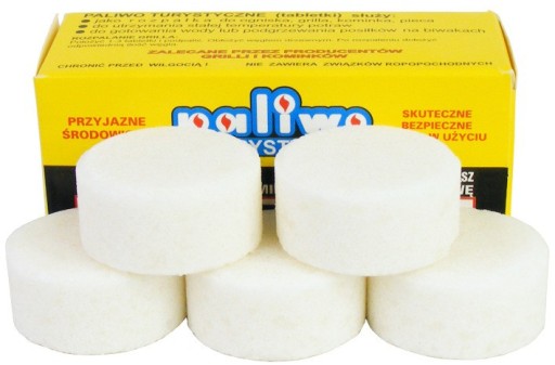 Heksaminowe paliwo turystyczne w kostkach do stosowania na biwaku, podczas wędrówek lub na rybach. Jedna 20-gramowa kostka płonie przez około 20 minut pozwalając zagotować w warunkach polowych wodę na herbatę lub podgrzać posiłek