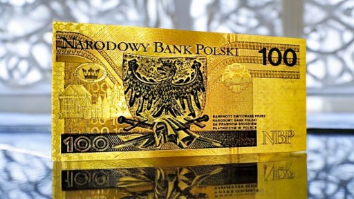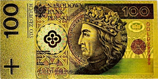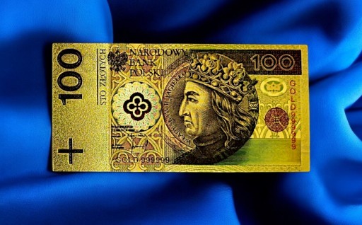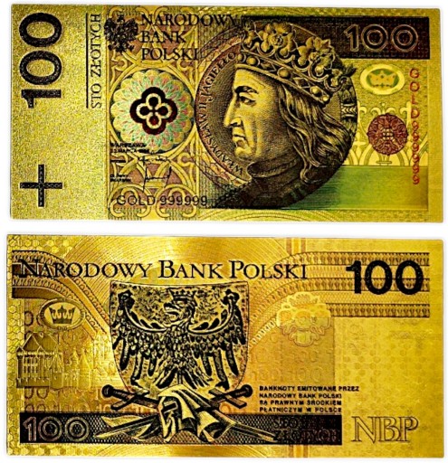 Piękna replika polskiego banknotu obiegowego o 100 złotowym nominale wykonana z PCV oraz pokryta złotą folią.