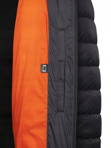 Męska kurtka puchowa z kapturem posiada lekką konstrukcję oraz wypełnienie z puchu syntetycznego, dzięki czemu zapewnia komfort i optymalny komfort cieplny podczas użytkowania. Hydrofobowa impregnacja materiału spowalnia wchłanianie wilgoci z zewnątrz.