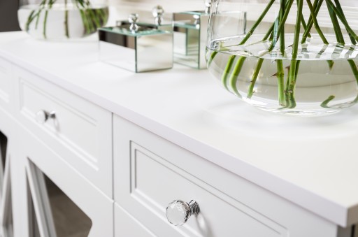 Blat ma grubość 10 cm, wykonany jest z precyzyjnie wyszlifowanego lustra kryształowego. Posiada szufladę, a na jej środku przymocowany jest wyrafinowany i elegancki uchwyt – kryształowa gałka, u podstawy chromowana. Szuflada na życzenie klienta może być na dnie wykończona skórą. Szerokość szuflady przy konsolce szerokości 80 cm, wynosi 55 cm. Całość osadzona została na subtelnym i ekskluzywnym stelażu pokrytym chromem, jego profil jest kwadratem 4,5 cm x 4,5 cm, odpornym na upływ czasu. Inspiracją do opracowania stelaża, który jest obrysem konturów, były tradycyjne meble codziennego użytku.