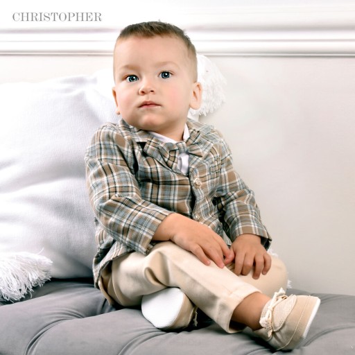 Garnitur w zestawie ma spodenki z tkaniny rozciągliwej, co ułatwia ubieranie dziecku, marynarka w krateczkę z tkaniny typowo garniturowej. Koszulo-Body to tkanina koszulowa z bawełny zapinane w kroku.