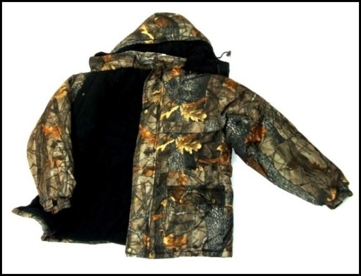 Komplet zimowy - kurtka i spodnie na szelkach. Kamuflaż jak na zdjęciu - liście. Jest bardzo lekki i ciepły. Skutecznie ochroni przed dużym mrozem, nawet przy -30 C. Waga kompletu 2,8 kg.