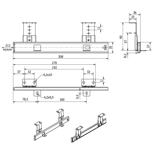 - <97,2cm x 31cm> to całkowite wymiar szuflady z prowadnicami i mocowaniami pod blatowymi skierowanymi na zewnątrz.