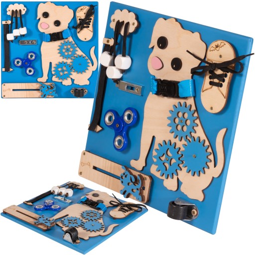 DREWNIANA TABLICA MANIPULACYJNA DLA DZIECI 9w1 PIES HUGO NIEBIESKA