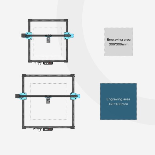 Oś X i Y mają precyzyjne skale do szybkiego pomiaru grawerowanych obiektów, obszar grawerowania 300 x 300 mm może zaspokoić różne potrzeby grawerowania. Dodatkowo poprzez wydłużenie osi ramki pole grawerowania można powiększyć do 420x400mm. Spełnia to potrzeby grawerowania na większych powierzchniach.