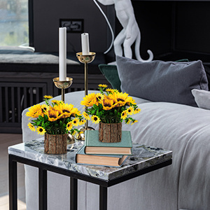 Piękny wygląd- dużo zielonych liści, w połączeniu ze sztucznymi słonecznikami i doniczkami cała sztuczna roślina doniczkowa jest bardzo żywa i piękna.