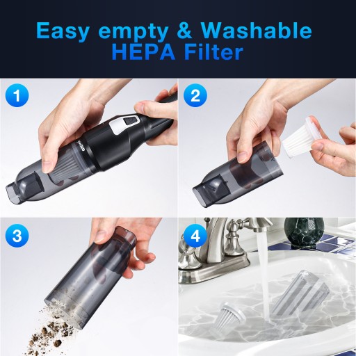 【Zmywalny filtr HAPA】 Odkurzacz ręczny z trwałym filtrem ułatwiającym pranie. Po każdym użyciu wyczyść i wysusz filtr i HEPA, a może on wystarczyć tak długo, jak chcesz, nawet przy częstym użytkowaniu. W razie potrzeby możesz też wymienić HEPA. (Ciepła podpowiedź: nie płucz odkurzacza podczas czyszczenia HEPA, aby zapobiec zwarciu i niebezpieczeństwu.)