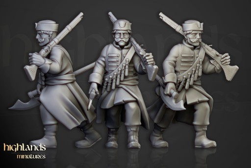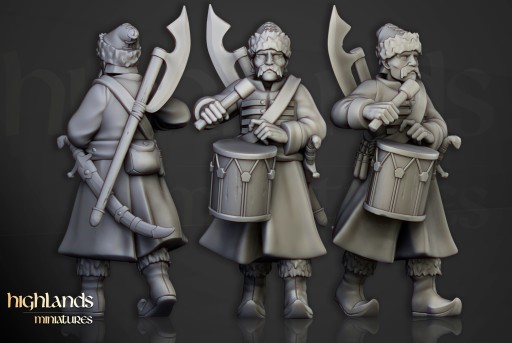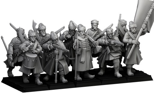 Przedmiotem oferty jest zestaw dziesięciu modeli Harbor Streltsy CMD od Highlands Miniatures, wydrukowanych na drukarce 3D w technologii SLA.