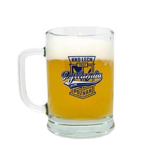 Efektowny, duży kufel zdobiony grafiką Pyrlandia. Wykonany z solidnego, grubego szkła. Wysoka jakość wykonania.