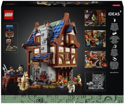 Minifigurki i nie tylko Zestaw zawiera cztery minifigurki, dzięki którym model ożywa: kowala, łucznika oraz dwóch rycerzy herbu Czarny Sokół, którzy mają cztery miecze, trzy tarcze i halabardę. W pudełku jest też ruchoma figurka konia z wózkiem oraz pies i żaba rzekotka. Nietuzinkowy prezent Zestaw jest częścią kolekcji inspirujących modeli LEGO, dzięki którym dorośli konstruktorzy mogą się zrelaksować podczas kreatywnego budowania. To świetny prezent dla miłośników LEGO i hobbystów.