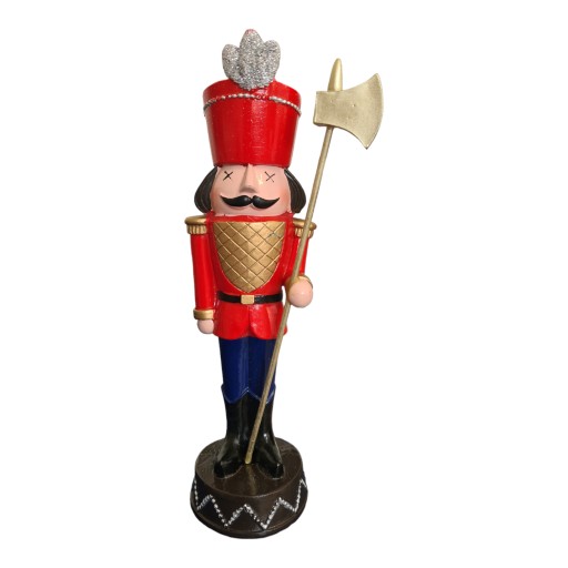 Przedstawiamy wyjątkowego Dziadka do orzechów, który doda uroku Twojej kolekcji Świątecznej. Ten unikalny Dziadek do orzechów przedstawia żołnierza w czerwonym kapeluszu i złotym toporze. Żołnierz nosi czerwoną kurtkę i niebieskie spodnie, a na twarzy ma czarne wąsy.
