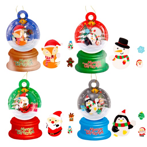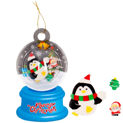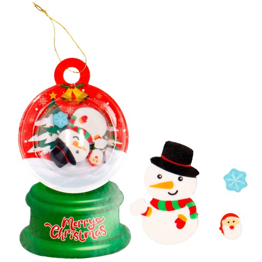 - zapakowane w ozdobny blister z kulą imitującą kulę śnieżną, w której znajdują się gumki