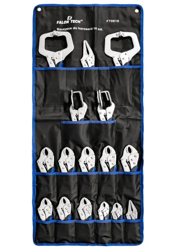 Specjalny zestaw szczypiec samozaciskowych przeznaczonych do prac blacharskich lub spawalniczych. Zestaw składa się z 16 elementów.