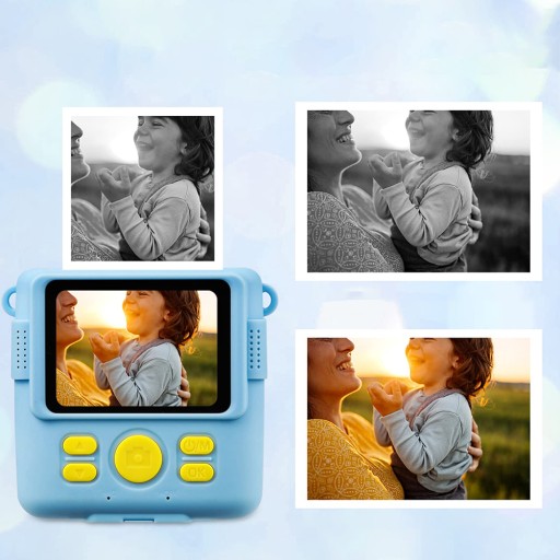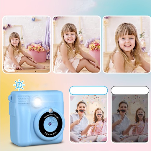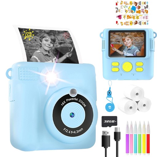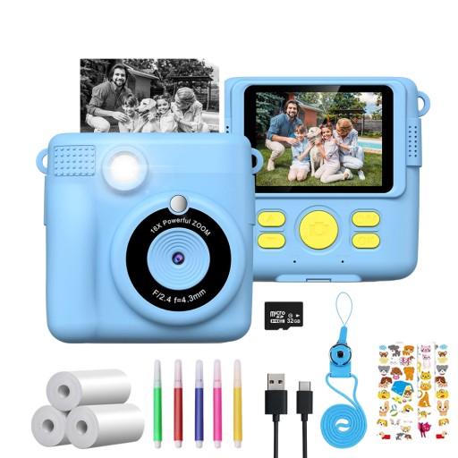 - Ten aparat dla dzieci umożliwia natychmiastowe drukowanie, duży ekran o przekątnej 2,4 cala, wideo w rozdzielczości 1080p, 16-krotny zoom cyfrowy, lampę błyskową, zdjęcia poklatkowe, seriale, gry, ramkę filtra i mp3.