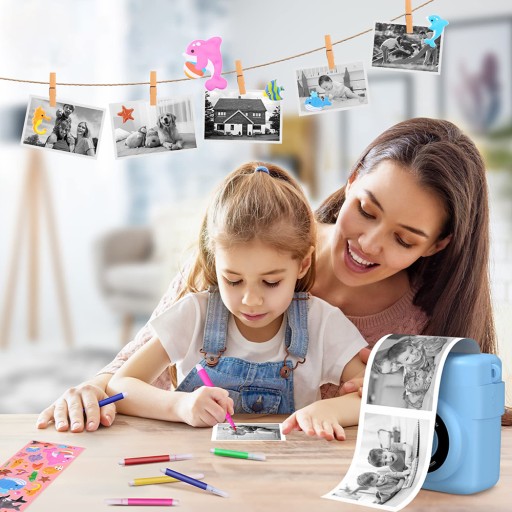 - Ten aparat dla dzieci z możliwością natychmiastowego drukowania, dużym ekranem o przekątnej 2,4 cala, wideo 1080P, 16-krotnym zoomem cyfrowym, lampą błyskową, funkcją nagrywania poklatkowego, zdjęciami seryjnymi, grami, ramką filtra, mp3.