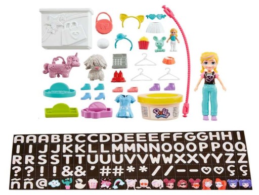 Tęczowe centrum handlowe Polly Pocket z akcesoriami i laleczką. Zestaw posiada mnóstwo obszarów zabawy. Jest to np.: stanowisko z popcornem, chmurkowa winda, stragan do sprzedaży ciastek i hot dogów, taras z krzesłami i stolikiem, toaleta i różnego rodzaju sklepy (np. te z ubraniami czy butami).