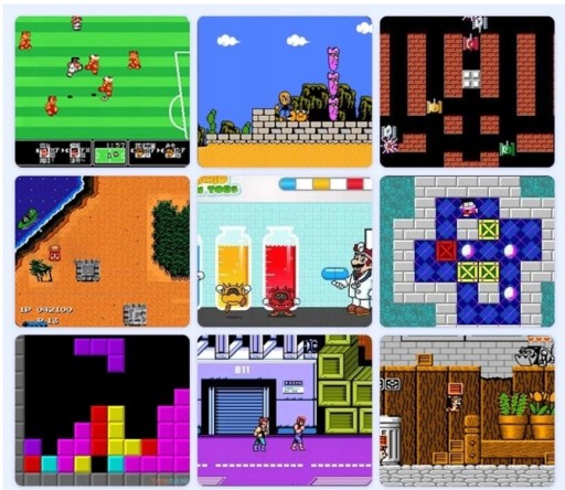 Contra, Super Contra, Chip & Dale, World Cup Soccer, Tetris 2, Tank A1990, Street Fighter V, kultowy Super Mario Bros, Super Mario Bros 3, Super Mario Bros 6, Super Mario 14, a ponadto: Batman, Spider Man, Tom & Jerry, Pacmania, 1942, Angry Bird, Arkanoid, Dr. Mario, F1 Race, Pac-Man, Donkey Kong, Bomberman, Galaga, Galaxian, niezapomniany Pinball, Space Invaders, czy Zippy Race.