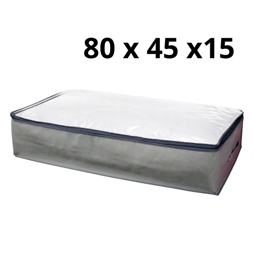 Pojemnik do przechowywania ma wymiary 80 x 45 x 15 cm i pojemność 75 litrów. Idealnie sprawdzają się do przechowywania odzieży, pościeli, kołder, poduszek, koców, butów, zabawek i innych przedmiotów. Organizery pasują pod łóżko. Można je umieścić również na szafie, na strychu lub w suchej piwnicy.
