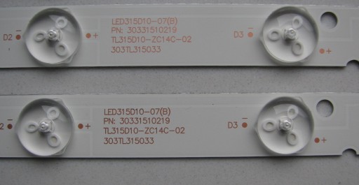 Podświetlanie matrycy / listwy LED315D10-07 (100% kompatybilne / zamienne za modele TL315D10-ZC14C-02 / 315D10-ZC14-07A / 303TL315033 itp). Listwy NOWE, 100% sprawne - wysokiej jakości zamiennik wykonany na aluminium. Dodatkowo na życzenie klienta mogę podkleić specjalna taśmą termo-przepuszczalna firmy 3M żeby dobrze dolegały do obudowy i odprowadzały ciepło - wówczas proszę o taką informację po zakupie..