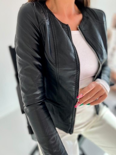 - Modelka ma na sobie kurtkę w rozmiarze 36.
