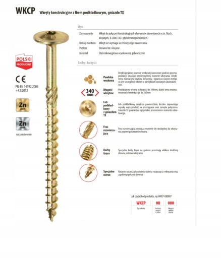 Wkręty do połączeń konstrukcyjnych elementów drewnianych min. litych , klejonych , X-LAM , LVL, więźba dachowa, szkielety konstrukcyjne budynku, kontrłaty i łaty, płyty drewnopochodne.
