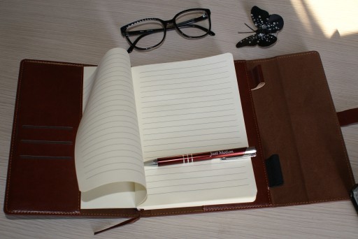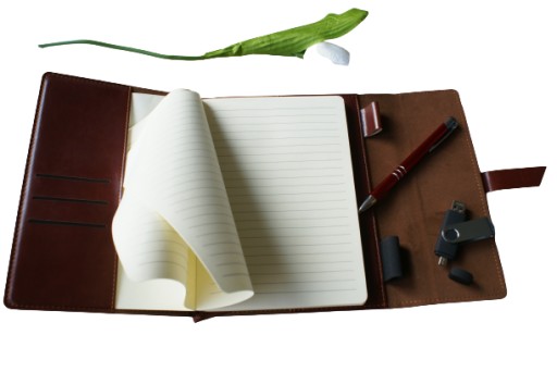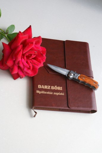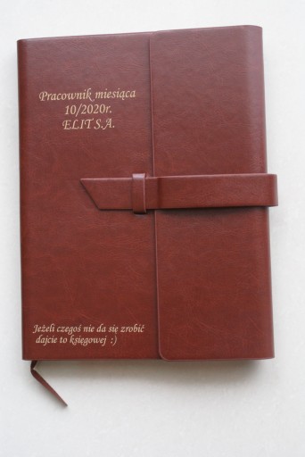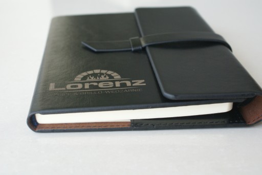 Elegancki notes formatu A5 w klasycznej okładce wykonanej z ekoskóry. Notes zawiera 80 kartek w linie oraz praktyczną wstążeczkę - zakładkę. Wewnątrz okładki miejsce na 3 wizytówki, długopis (jest w komplecie) oraz pamięć USB (brak w komplecie). Okładka nie jest umocowana na stałe do bloku notesu, tylko nasuwana na pierwsze kartki, co daje możliwość wymiany notesu. Notes zamykany za pomocą paska z ekoskóry. Na okładce wykonujemy grawer według Twoich informacji. (przed wykonaniem możemy zrobić projekt)