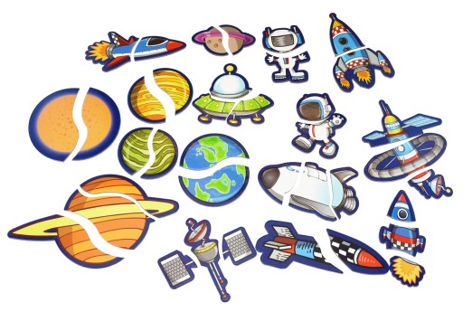 Układanka magnetyczna, która wygląda jak książka. W środku znajdziemy tablicę magnetyczna na której znajduje się rysunek kosmosu.To właśnie tutaj dziecko przyczepia i układa kosmiczne pojazdy oraz planety na wzór rysunków znajdujących się na 16 kartach.