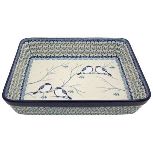 Ceramika Bolesławiec - HANDMADE. Wzór Unikatowy - ptak gil. Dwa ptaki w kolorach zimy. Wykończenie obrzeża w kolorze granatowym.