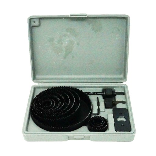 Zestaw pił otwornicowych, który zawiera 12 pił otwornic ze stali węglowej