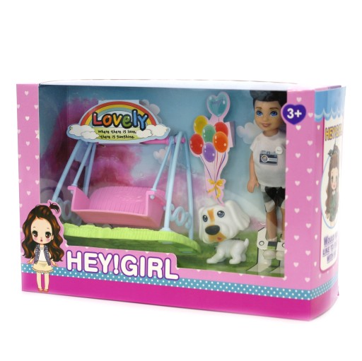 W zestawie laleczka, pies oraz huśtawka.