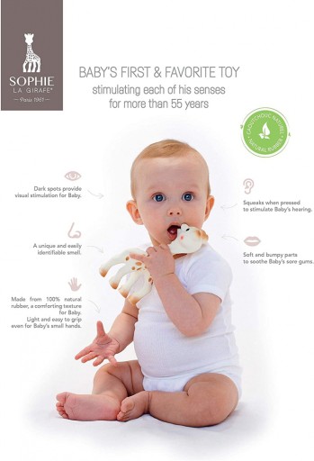 – klasyczny gryzak Żyrafa Sophie, o wysokości ok. 18 cm., wykonany w 100% z lateksu – z żywicy drzewa gumowego. Naturalne tworzywo, pokryte farbą spożywczą, jest bezpieczne do żucia, lekkie i elastyczne, co chroni przed bolesnymi urazami podczas machania. Obłe kształty są łatwe do uchwycenia dla małej rączki. Gryzak stymuluje i rozwija 5 zmysłów : wzrok – kontrastowe cętki, słuch – piszczałka umieszczona w brzuchu, dotyk – specyficzny dotyk kauczuku, gładki jak skóra mamy, zapach – szczególny zapach naturalnej gumy, pozwalający odróżnić gryzak w stosie innych zabawek, smak – główny zmysł poznawczy maluszka. Doskonałe remedium na ząbkowanie;