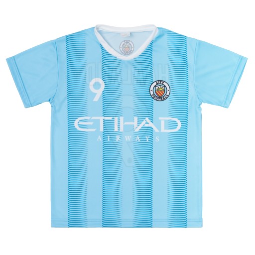 Posiadamy w sprzedaży nowe komplety strojów + getry z motywem HAALAND MACHESTER CITY 9 w rozmiarze 134cm.