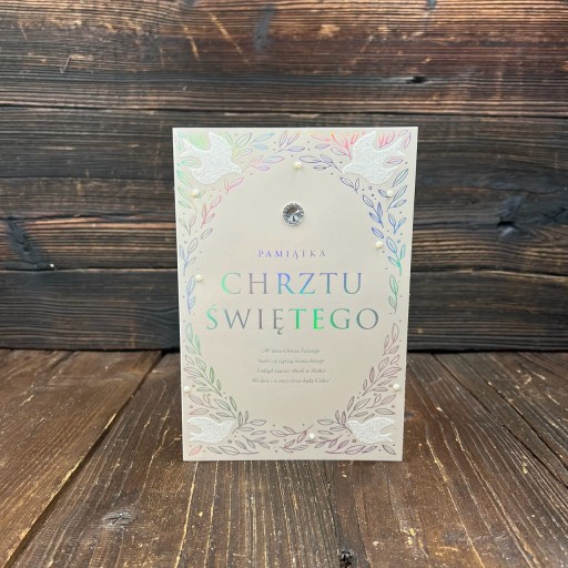 Kartka okolicznościowa z okazji Chrztu Świętego w kolorze perłowym, ze srebrnym akcentem i napisem "Pamiątka Chrztu Świętego". Kartka przepięknie mieni się we wszystkich kolorach tęczy. Zawiera życzenia oraz białą kopertę w zestawie.