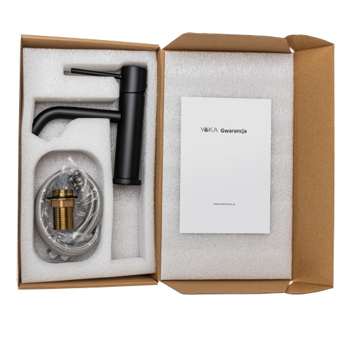 Korpus baterii wykonano ze stali nierdzewnej. Zestaw zawiera 2 wysokiej jakości wężyki w oplocie ze stali nierdzewnej o długości 50 cm ze standardowym przyłączem 3/8 cala oraz komplet akcesoriów do montażu baterii.