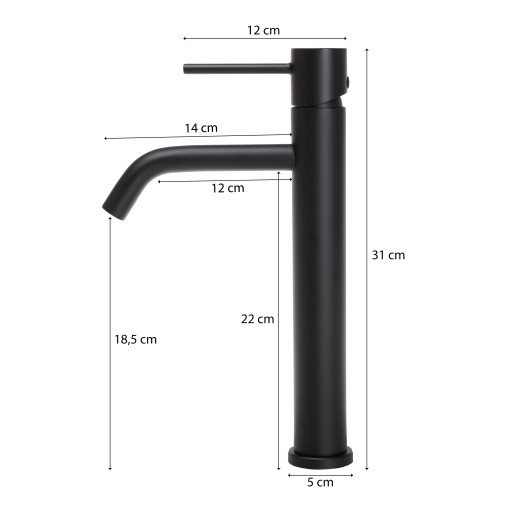 Wysoka bateria umywalkowa, stojąca, jednouchwytowa ze stałą wylewką. Ceramiczna wymienna głowica 35 mm.